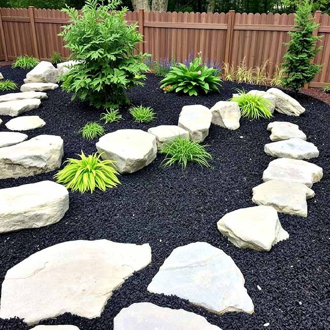Create an inviting and functional multi-zone yard by using black mulch and white rock landscaping to define different outdoor areas. For example, use white rocks around seating areas or fire pits to keep the ground firm and clean, and black mulch in garden beds or playground zones for softness and plant health.