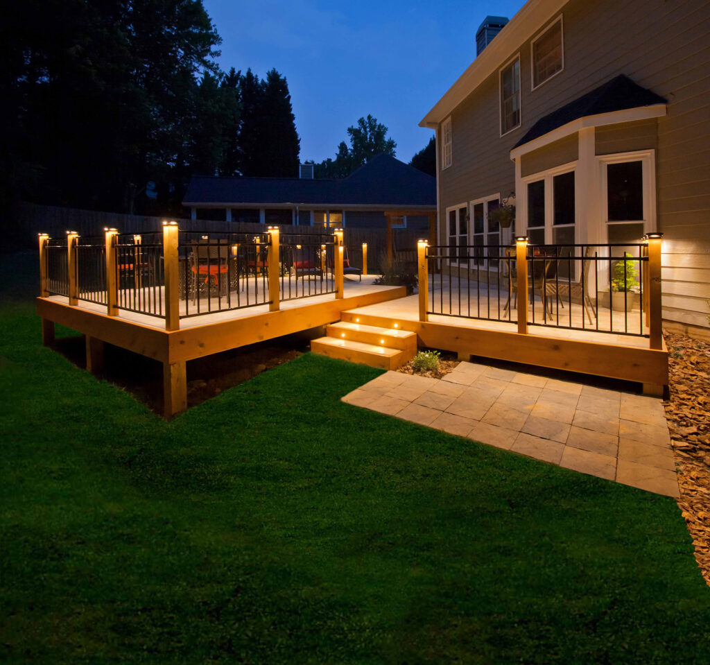 Lighting is an essential feature for any deck, not only for function but also to enhance the ambiance of your outdoor space. Custom lighting allows you to design your deck with a unique, personal touch. Consider built-in lights along railings, stairs, and the perimeter of your deck for subtle illumination.