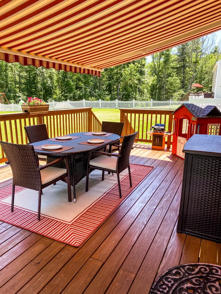 Choose simple, modern patio furniture to complement the clean lines of the concrete, such as metal or wood chairs and a sleek dining table. Incorporating an outdoor rug can also help to define the space and add warmth. This design is ideal for those who want a stylish, low-maintenance deck that’s perfect for year-round entertaining.