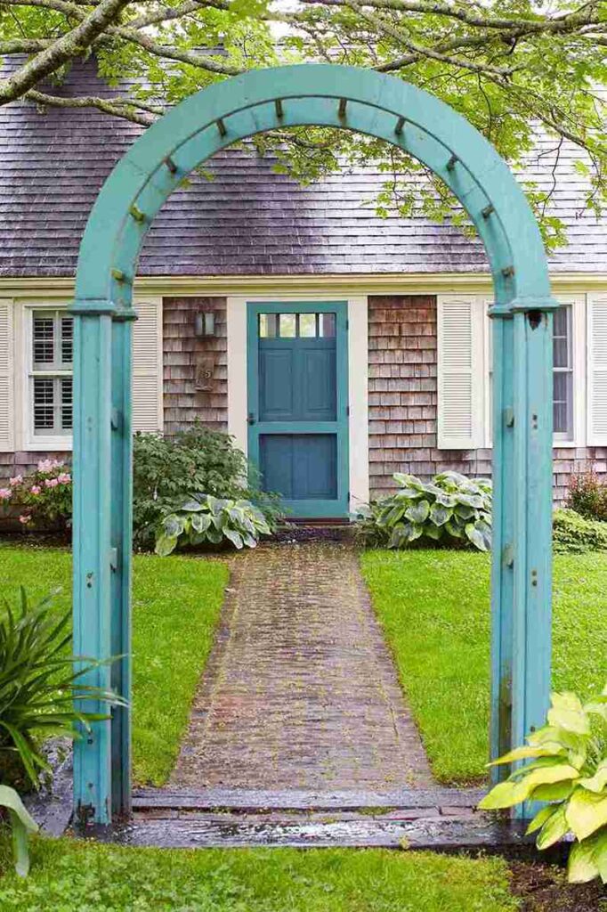 Who says trellises are only for summer? I love the idea of painting one a bold, happy color and then dressing it up as the seasons change. That bright blue is such a mood-booster, and adding a wreath or some ornaments makes the garden feel festive even when the plants are dormant.