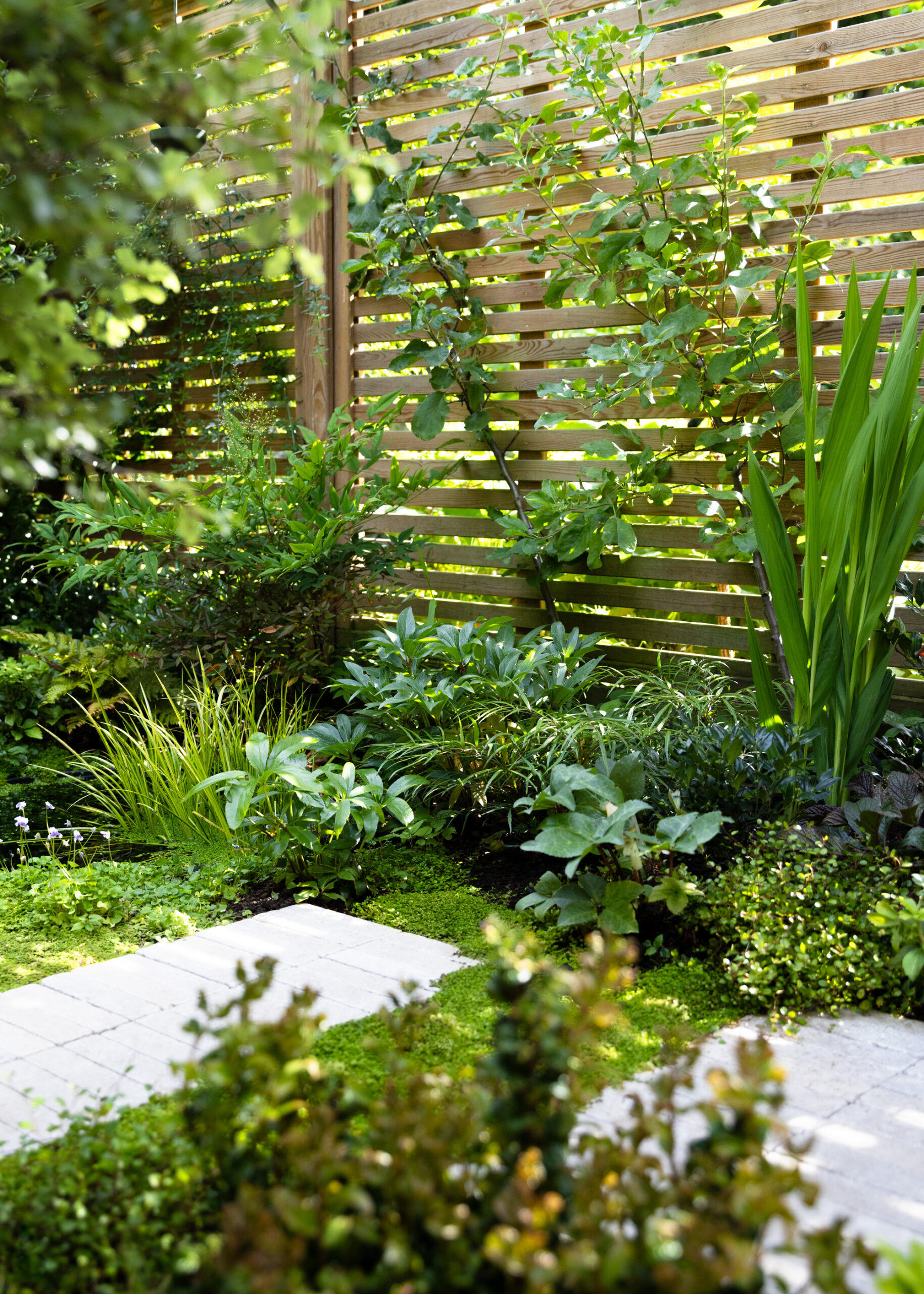 This design offers a balance between privacy and openness by using slatted wood panels combined with greenery. The slats are spaced to provide privacy while still allowing airflow and sunlight to pass through, and you can supplement the look with plants growing between the slats. Choose plants like ferns or creeping thyme for ground coverage or trailing vines like ivy and jasmine to climb the slats for an elegant touch.