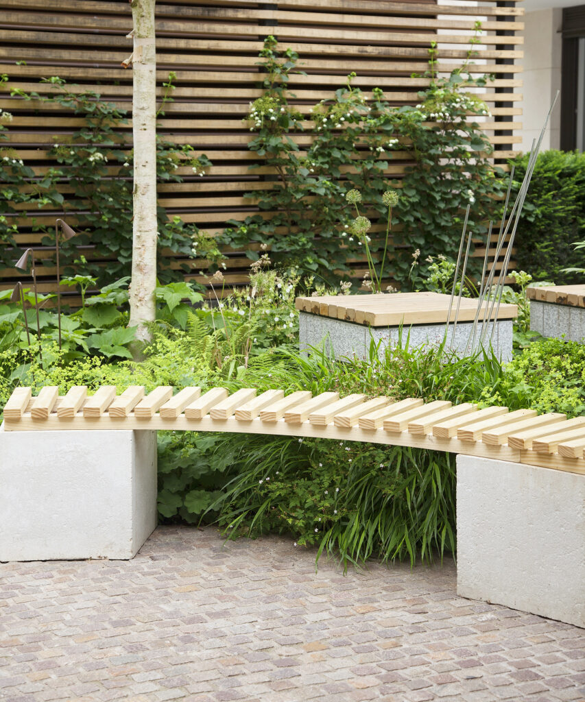 The slatted wood fence combined with plants allows your outdoor living area to blend seamlessly with the surrounding environment, creating a private yet inviting space that feels connected to nature.