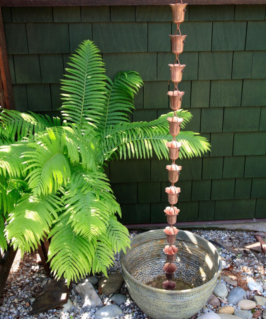 A tumbler rain chain adds a touch of modern sophistication to your outdoor decor. Its unique shape makes it an excellent option for minimalist or industrial-style spaces, particularly those with modern patio furniture. It can be the focal point of a backyard or porch, drawing attention with its unique and bold design.