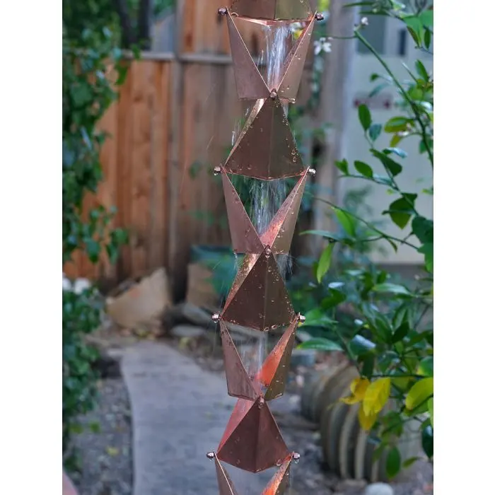 If you love bold design, a geometric metal rain chain offers a unique and modern twist on the classic rain chain. Featuring geometric shapes like squares, triangles, or hexagons, this style creates a striking visual effect as water flows through the angular shapes. The design is perfect for adding a touch of artistic flair to your outdoor space.