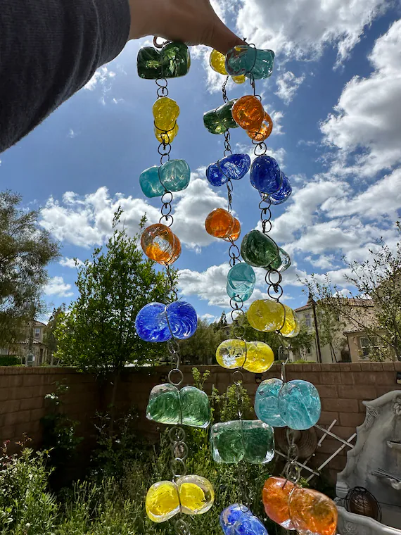 A recycled glass rain chain is ideal for eco-conscious homeowners who want to incorporate sustainability into their outdoor decor. It pairs well with modern back porch ideas or eclectic garden designs where vibrant colors and creative decor are embraced.