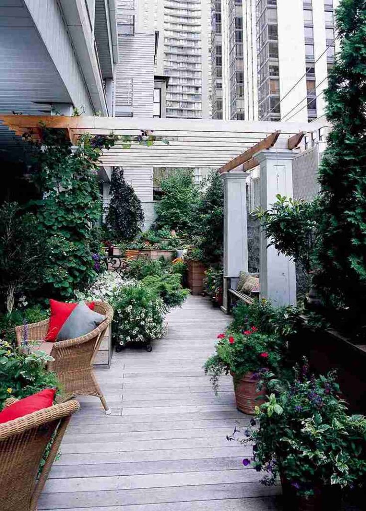 If you’re someone who burns easily, adding a retractable canopy is a literal game changer. You get to control the sun while you’re out there reading or sipping coffee. Plus, hanging some trailing flowers from the beams makes the whole space feel so much more intimate and tucked away.