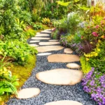 Another idea is to line the pathway with colorful flowers or low shrubs. This can create a vibrant border that complements the stones. You could choose plants that bloom in different seasons to keep the area lively year-round.